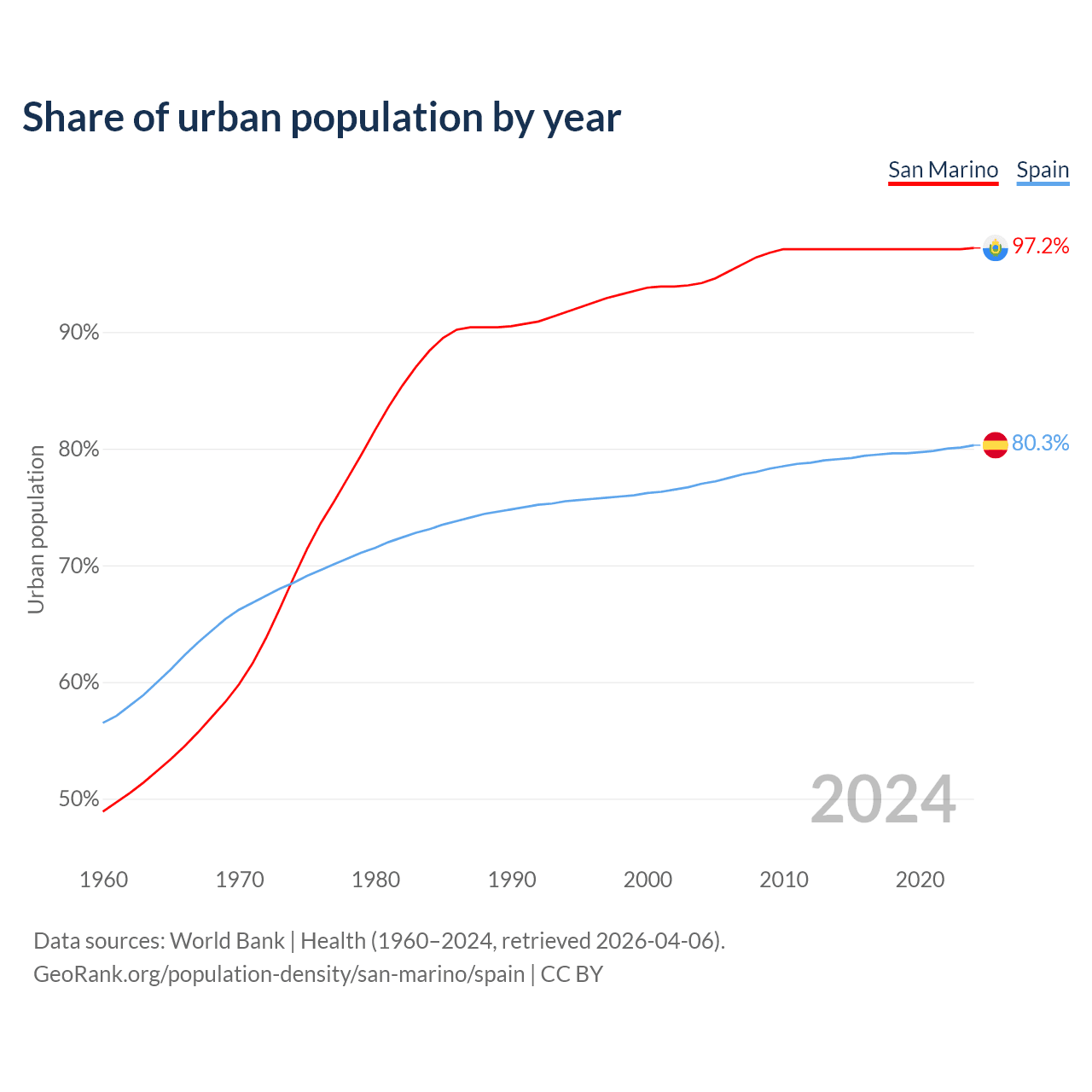 From 2004 to 2024, the share of urban population changed from 94.2% to 97.2% in San Marino and from 77% to 80.3% in Spain.