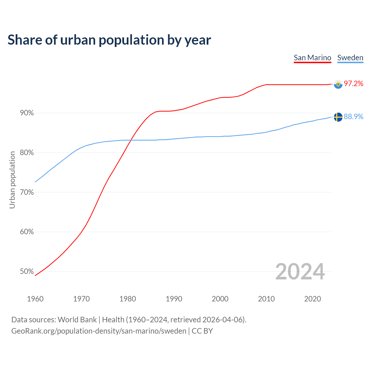 From 2004 to 2024, the share of urban population changed from 94.2% to 97.2% in San Marino and from 84.3% to 88.9% in Sweden.