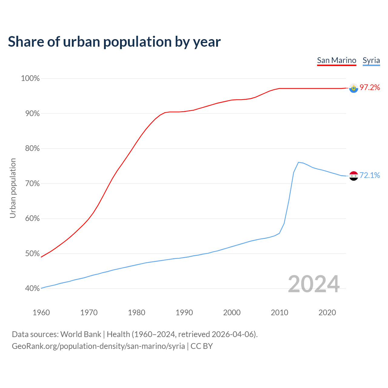 From 2004 to 2024, the share of urban population changed from 94.2% to 97.2% in San Marino and from 53.5% to 72.1% in Syria.
