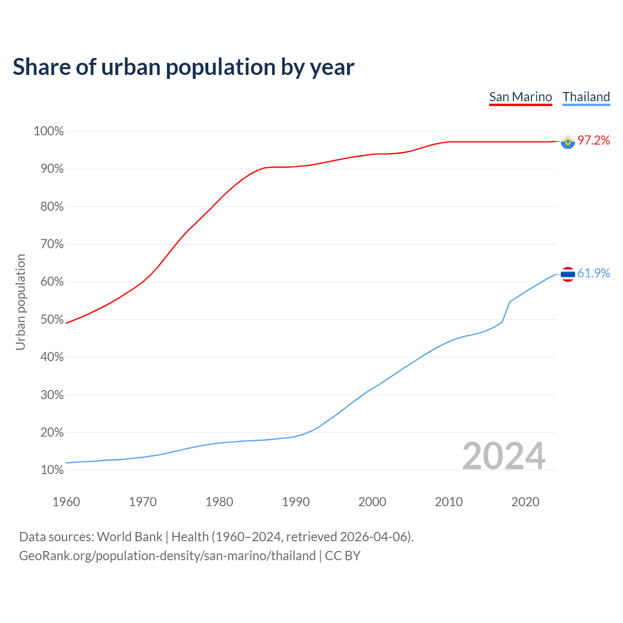 From 2004 to 2024, the share of urban population changed from 94.2% to 97.2% in San Marino and from 36.8% to 61.9% in Thailand.
