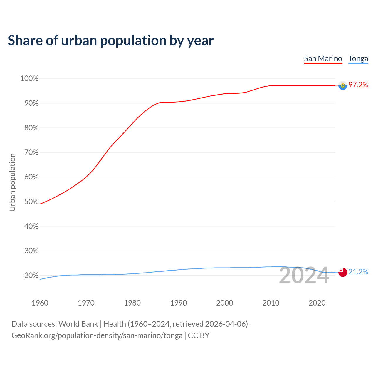 From 2004 to 2024, the share of urban population changed from 94.2% to 97.2% in San Marino and from 23.1% to 21.2% in Tonga.