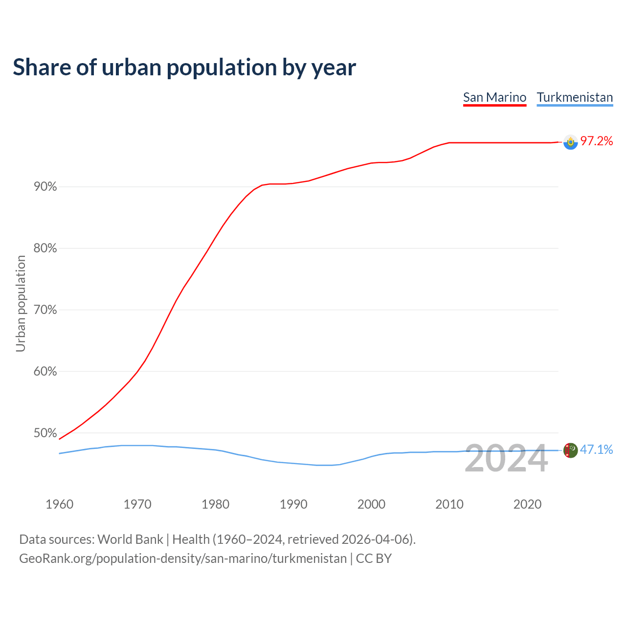 From 2004 to 2024, the share of urban population changed from 94.2% to 97.2% in San Marino and from 46.7% to 47.1% in Turkmenistan.