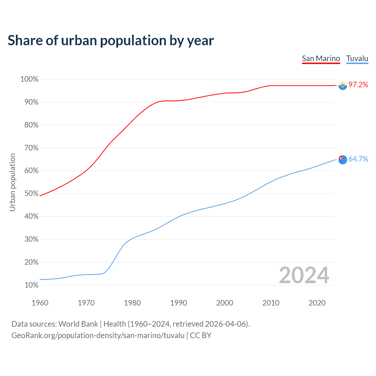 From 2004 to 2024, the share of urban population changed from 94.2% to 97.2% in San Marino and from 48.4% to 64.7% in Tuvalu.