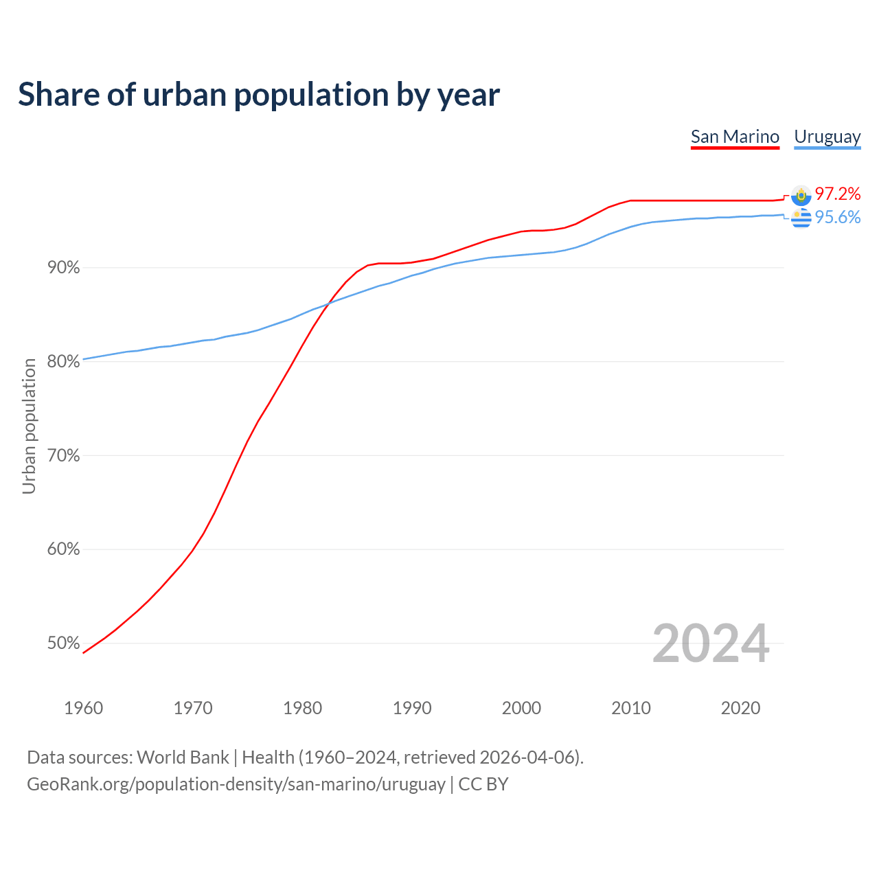 From 2004 to 2024, the share of urban population changed from 94.2% to 97.2% in San Marino and from 91.8% to 95.6% in Uruguay.