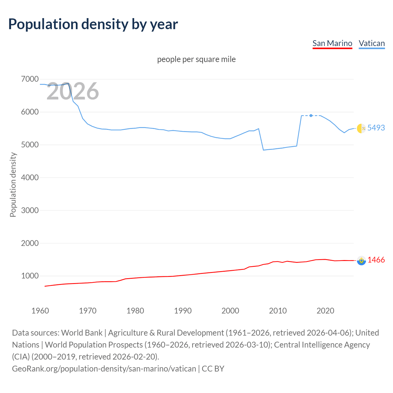 From 2006 to 2026, population density in San Marino increased by 12.5%, compared to a 0.13% growth in the Vatican.