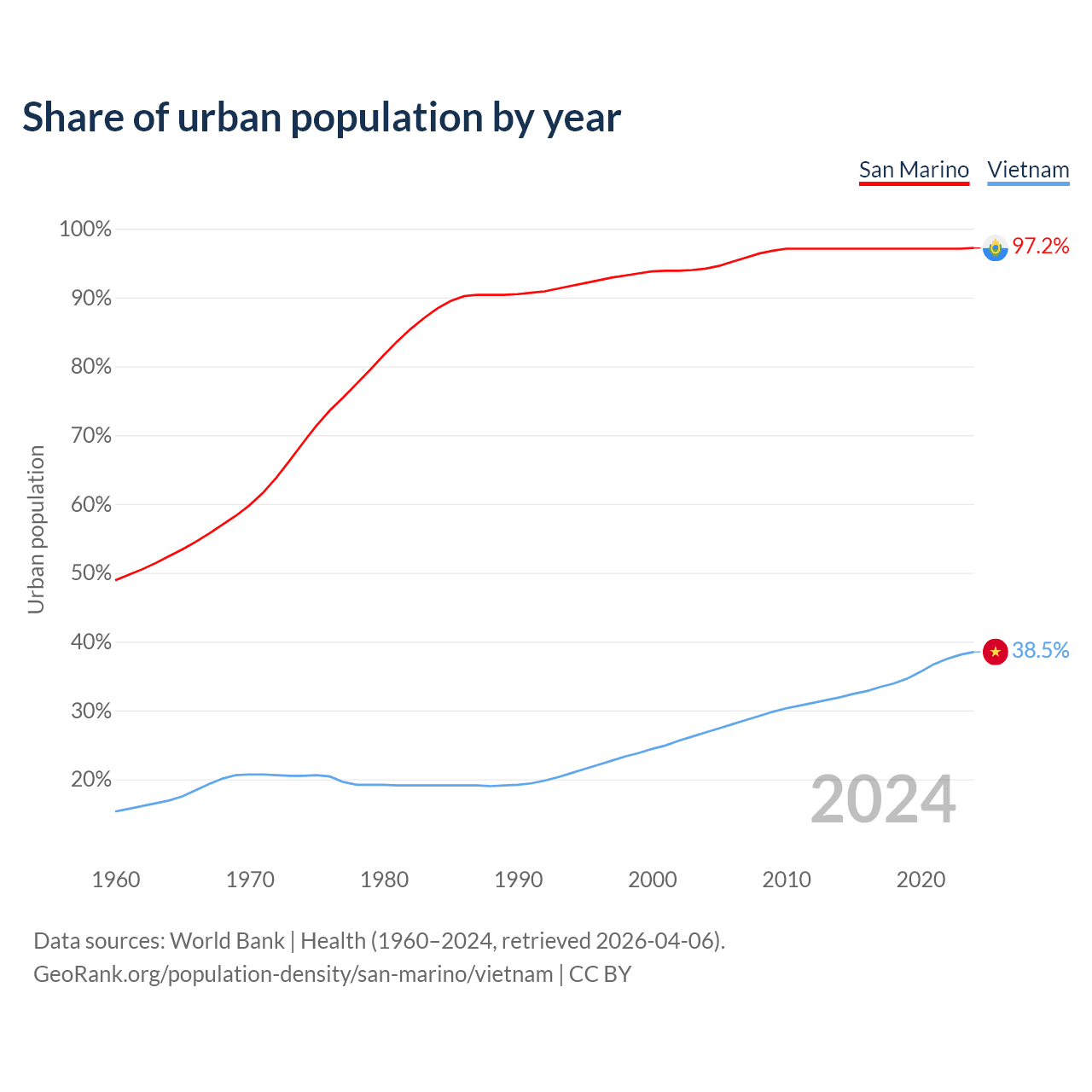 From 2004 to 2024, the share of urban population changed from 94.2% to 97.2% in San Marino and from 26.8% to 38.5% in Vietnam.