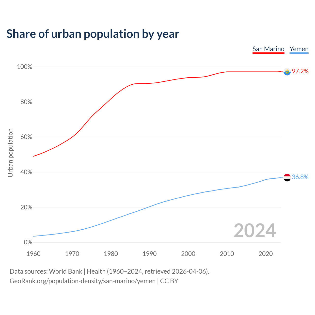 From 2004 to 2024, the share of urban population changed from 94.2% to 97.2% in San Marino and from 28.5% to 36.8% in Yemen.