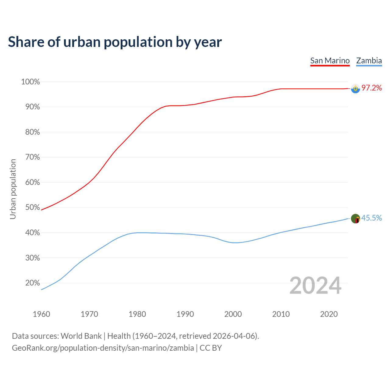 From 2004 to 2024, the share of urban population changed from 94.2% to 97.2% in San Marino and from 36.8% to 45.5% in Zambia.