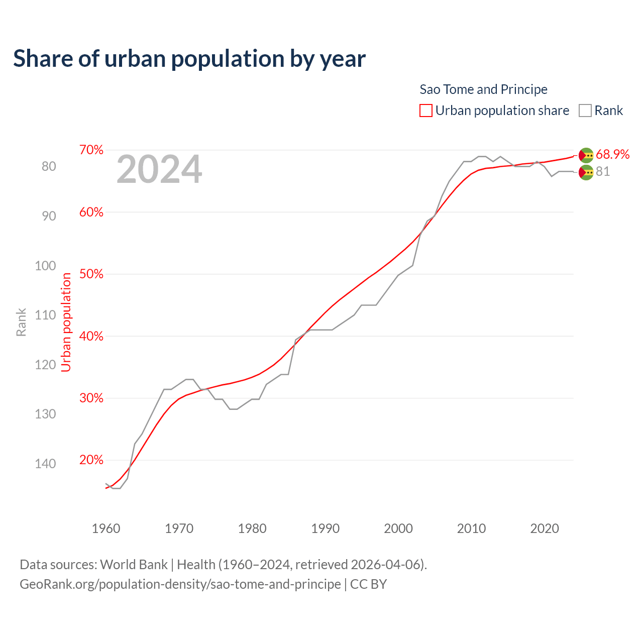 This chart shows the share of urban population in Sao Tome and Principe from 1960 to 2024: 15.4% lived in urban areas in 1960, 53% in 2000, and 68.9% in 2024.
