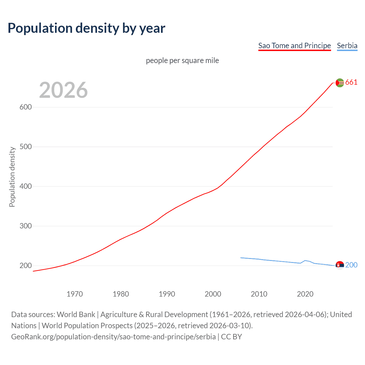 From 2006 to 2026, population density in Sao Tome and Principe increased by 48%, compared to a 8.86% decline in Serbia.
