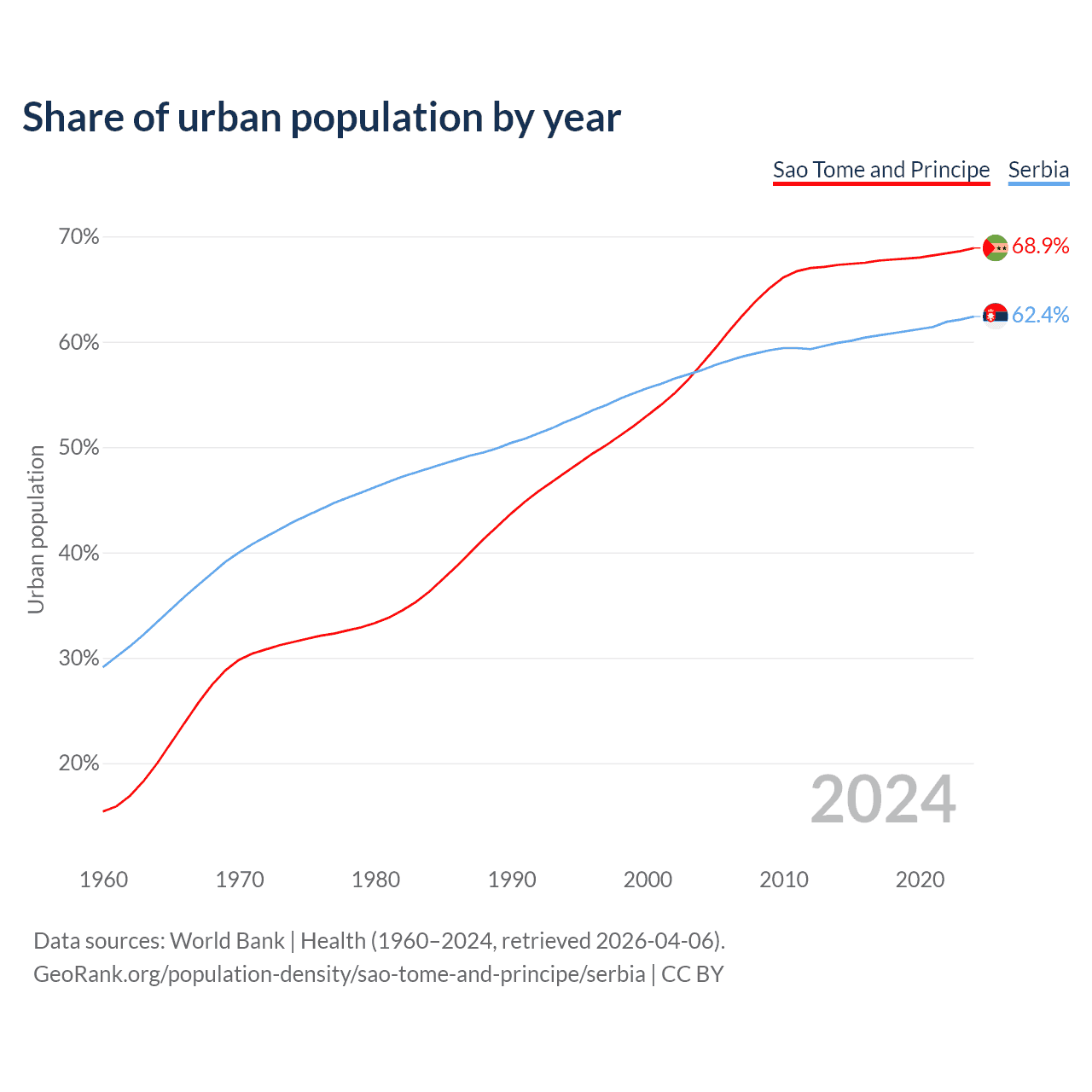 From 2004 to 2024, the share of urban population changed from 57.9% to 68.9% in Sao Tome and Principe and from 57.3% to 62.4% in Serbia.