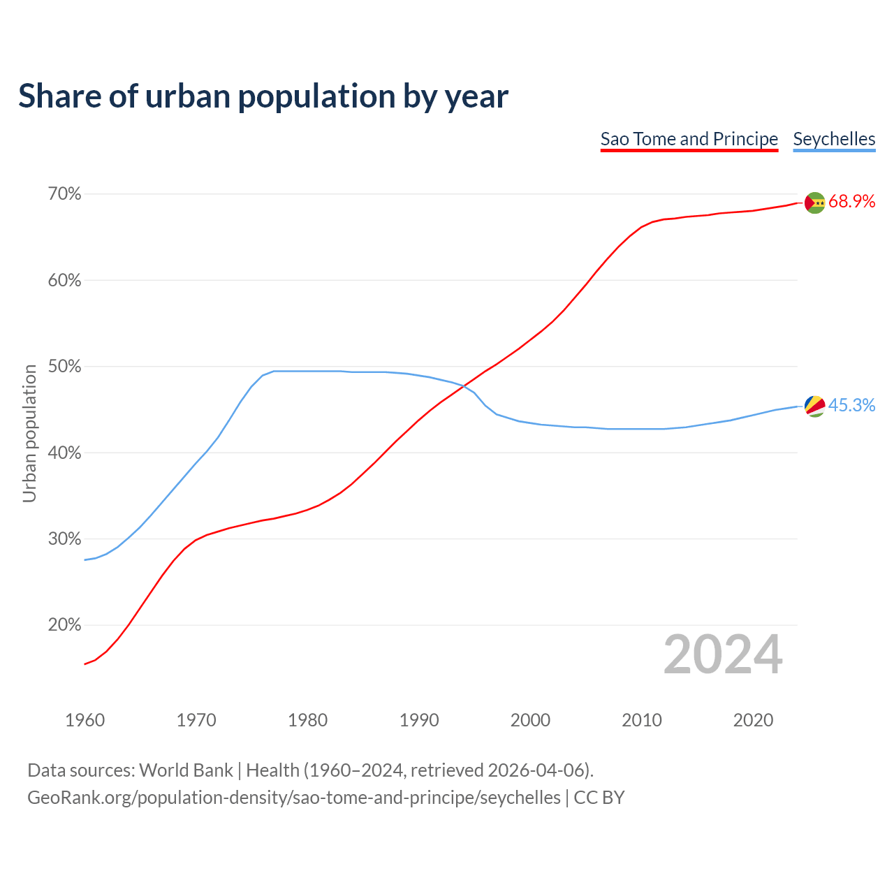 From 2004 to 2024, the share of urban population changed from 57.9% to 68.9% in Sao Tome and Principe and from 42.9% to 45.3% in the Seychelles.