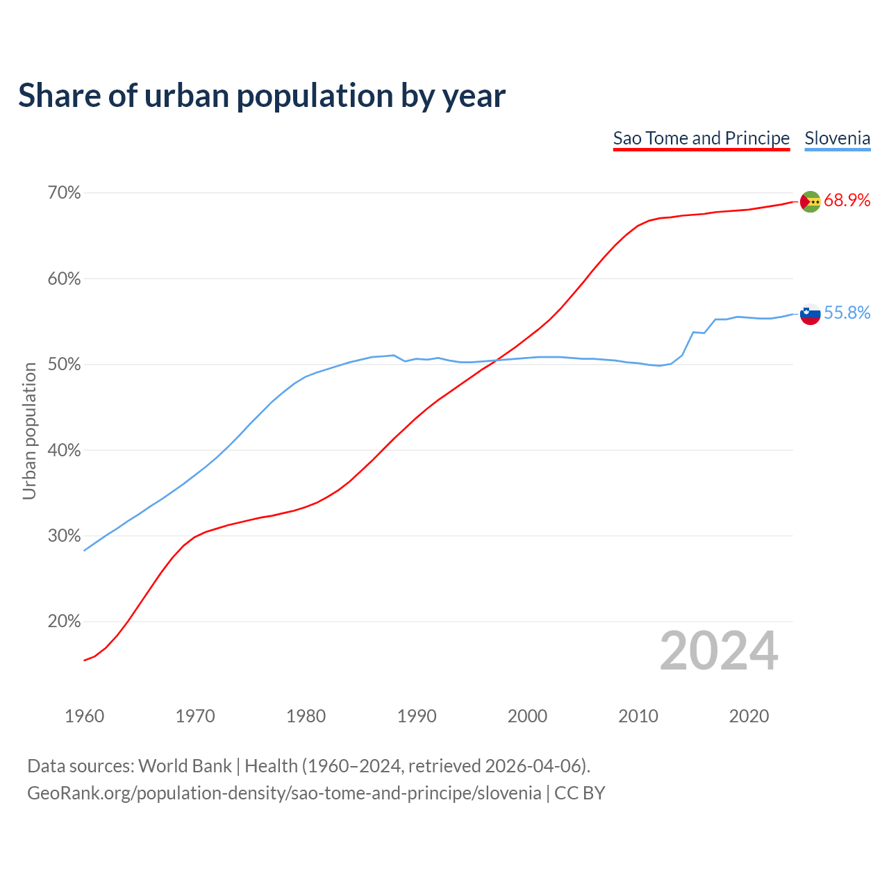 From 2004 to 2024, the share of urban population changed from 57.9% to 68.9% in Sao Tome and Principe and from 50.7% to 55.8% in Slovenia.