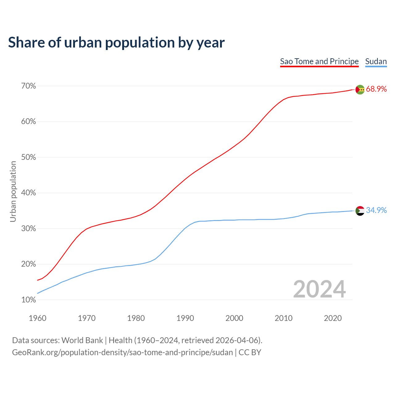 From 2004 to 2024, the share of urban population changed from 57.9% to 68.9% in Sao Tome and Principe and from 32.4% to 34.9% in Sudan.