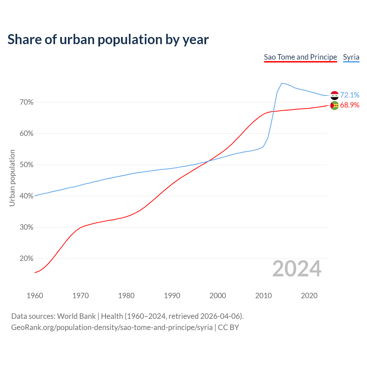 From 2004 to 2024, the share of urban population changed from 57.9% to 68.9% in Sao Tome and Principe and from 53.5% to 72.1% in Syria.