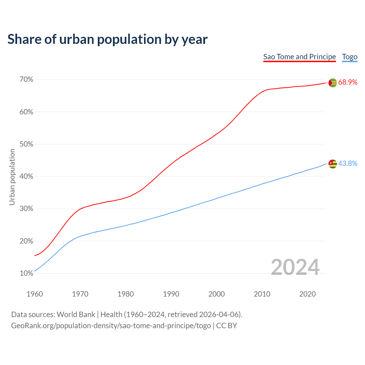 From 2004 to 2024, the share of urban population changed from 57.9% to 68.9% in Sao Tome and Principe and from 34.9% to 43.8% in Togo.