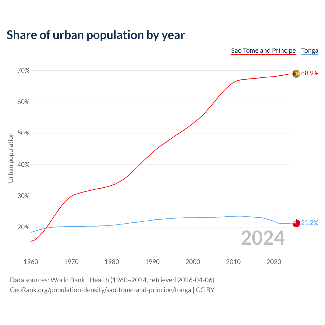 From 2004 to 2024, the share of urban population changed from 57.9% to 68.9% in Sao Tome and Principe and from 23.1% to 21.2% in Tonga.
