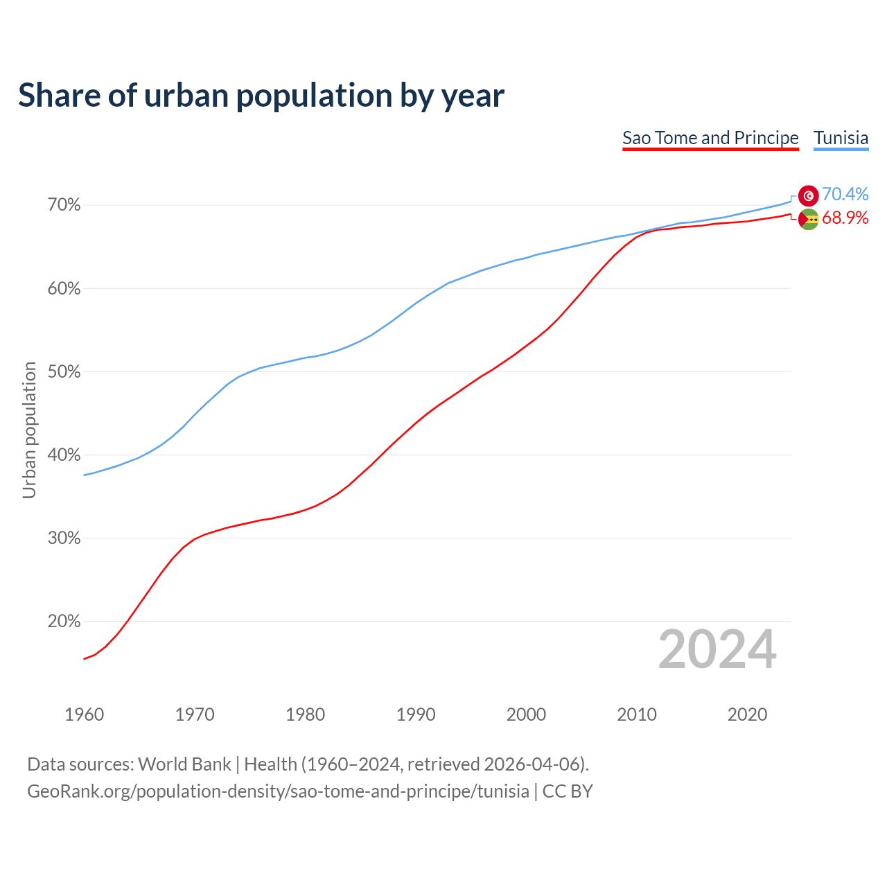 From 2004 to 2024, the share of urban population changed from 57.9% to 68.9% in Sao Tome and Principe and from 64.9% to 70.4% in Tunisia.