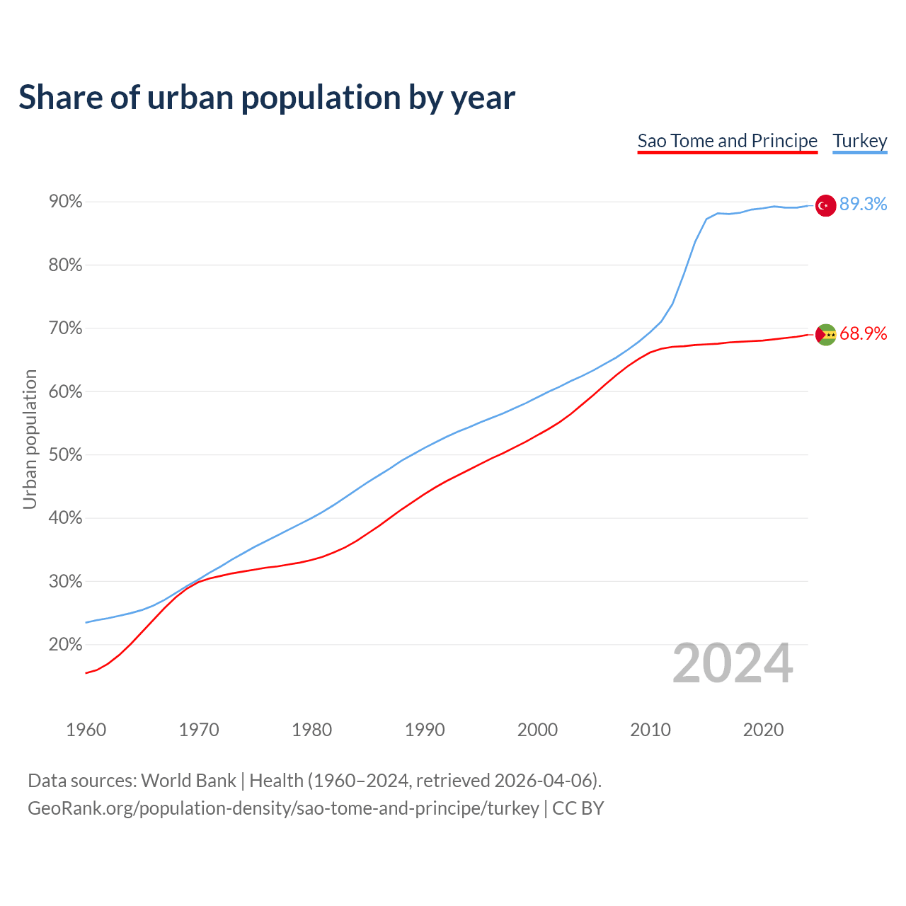 From 2004 to 2024, the share of urban population changed from 57.9% to 68.9% in Sao Tome and Principe and from 62.4% to 89.3% in Turkey.