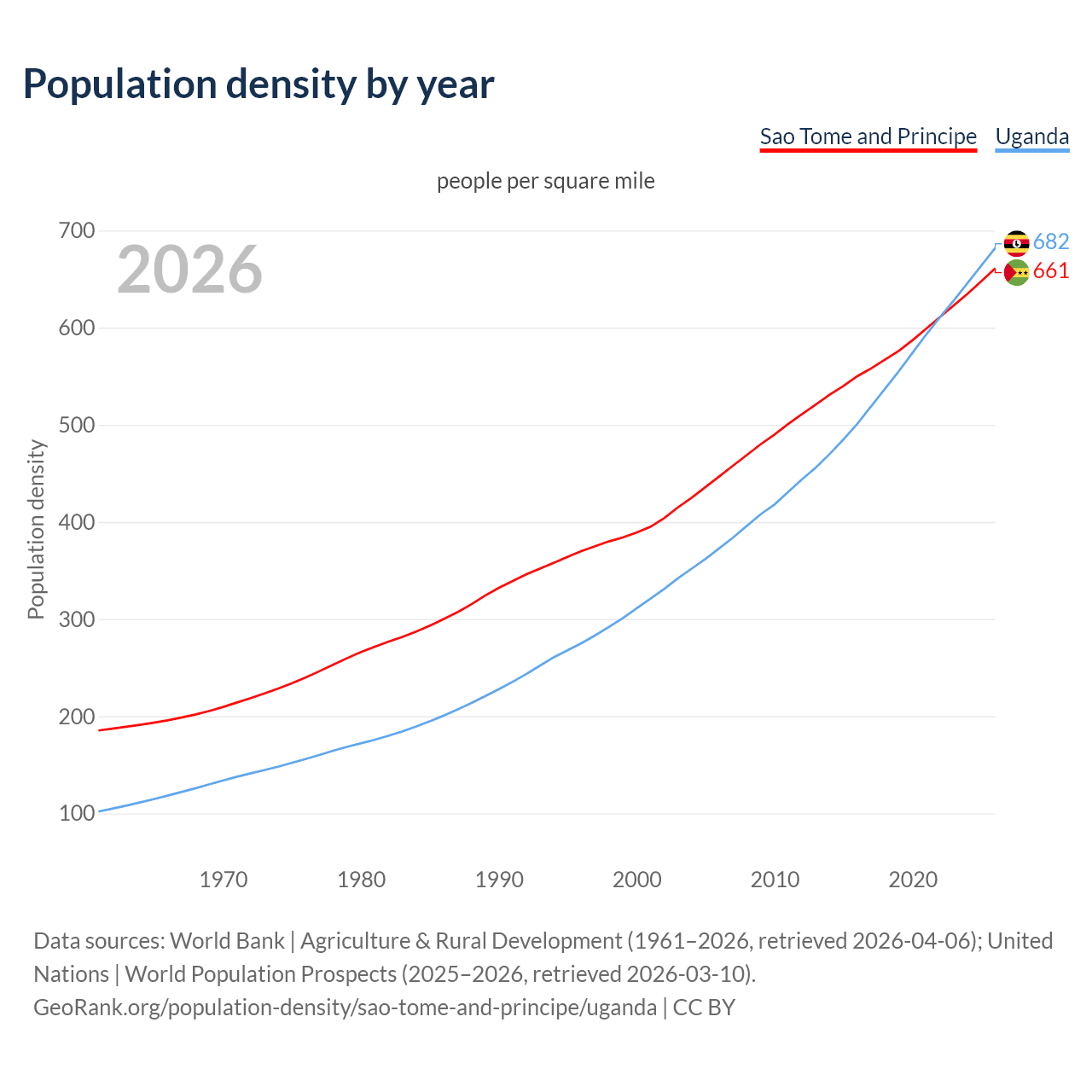 From 2006 to 2026, population density in Sao Tome and Principe increased by 48%, compared to a 82.7% growth in Uganda.