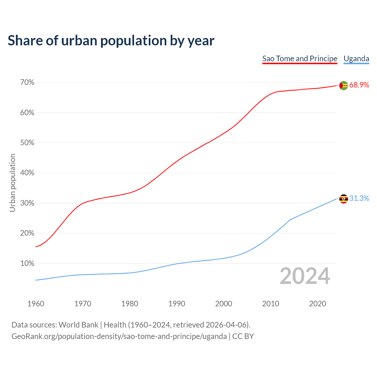 From 2004 to 2024, the share of urban population changed from 57.9% to 68.9% in Sao Tome and Principe and from 13.1% to 31.3% in Uganda.