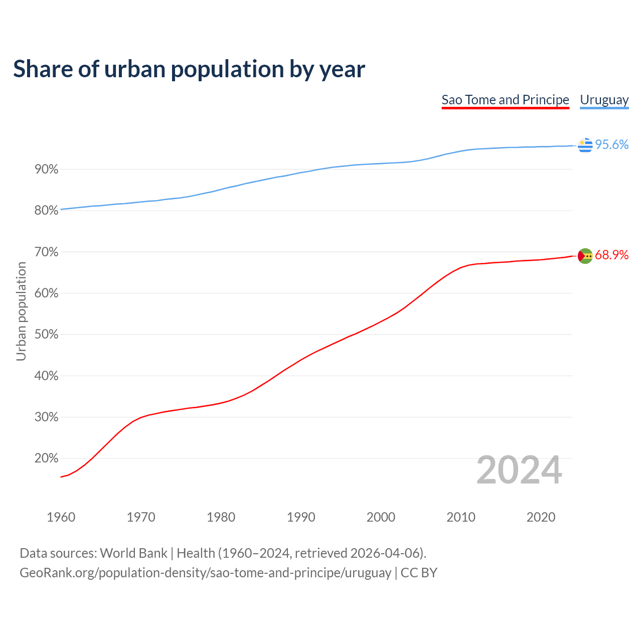 From 2004 to 2024, the share of urban population changed from 57.9% to 68.9% in Sao Tome and Principe and from 91.8% to 95.6% in Uruguay.