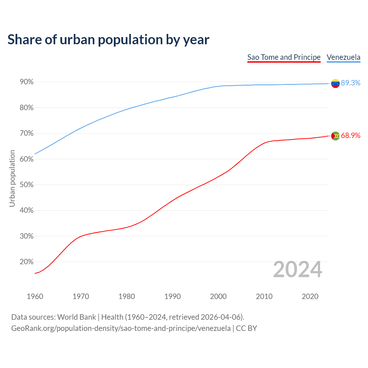 From 2004 to 2024, the share of urban population changed from 57.9% to 68.9% in Sao Tome and Principe and from 88.6% to 89.3% in Venezuela.
