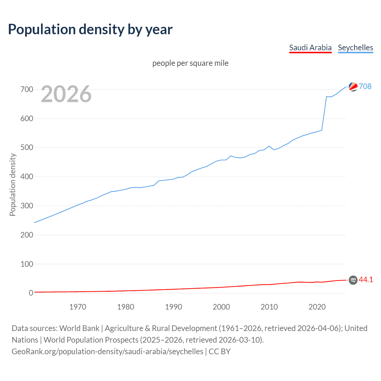 From 2006 to 2026, population density in Saudi Arabia increased by 70.4%, compared to a 48.7% growth in the Seychelles.