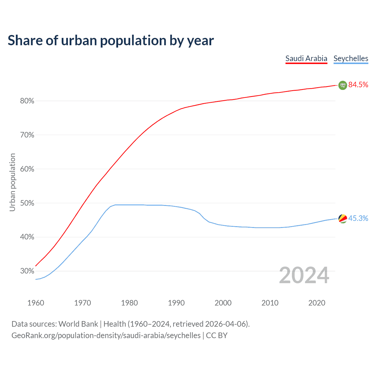From 2004 to 2024, the share of urban population changed from 80.8% to 84.5% in Saudi Arabia and from 42.9% to 45.3% in the Seychelles.