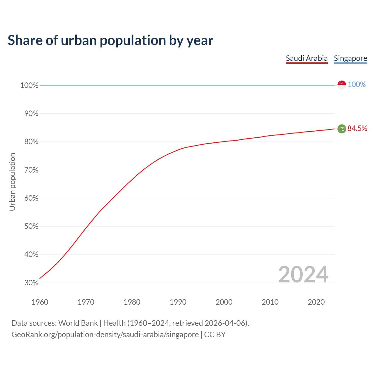 From 2004 to 2024, the share of urban population changed from 80.8% to 84.5% in Saudi Arabia and from 100% to 100% in Singapore.