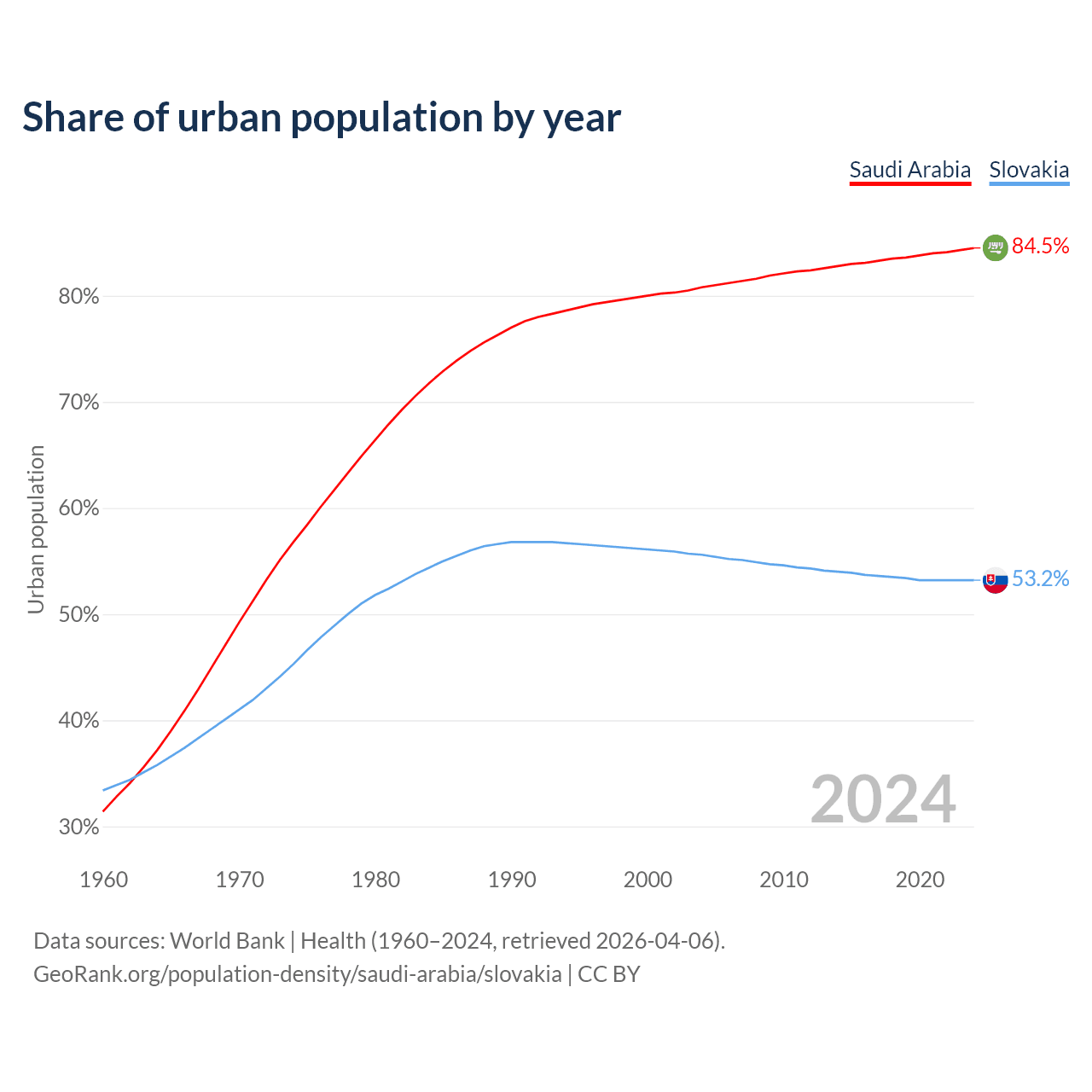 From 2004 to 2024, the share of urban population changed from 80.8% to 84.5% in Saudi Arabia and from 55.6% to 53.2% in Slovakia.