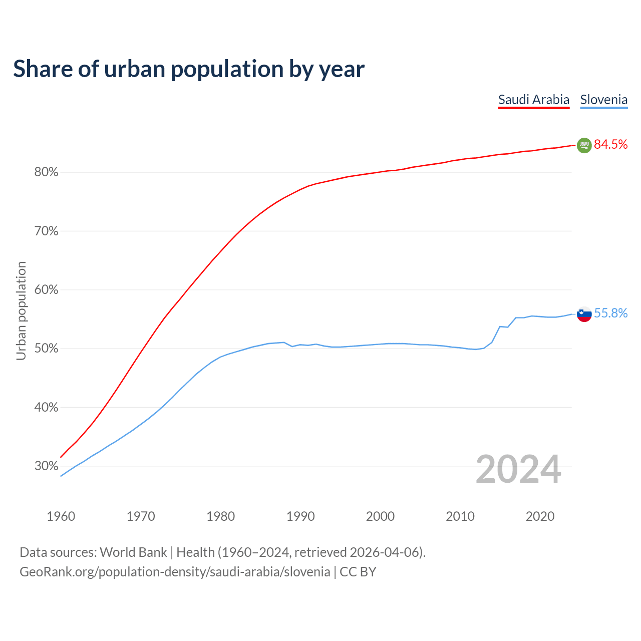 From 2004 to 2024, the share of urban population changed from 80.8% to 84.5% in Saudi Arabia and from 50.7% to 55.8% in Slovenia.