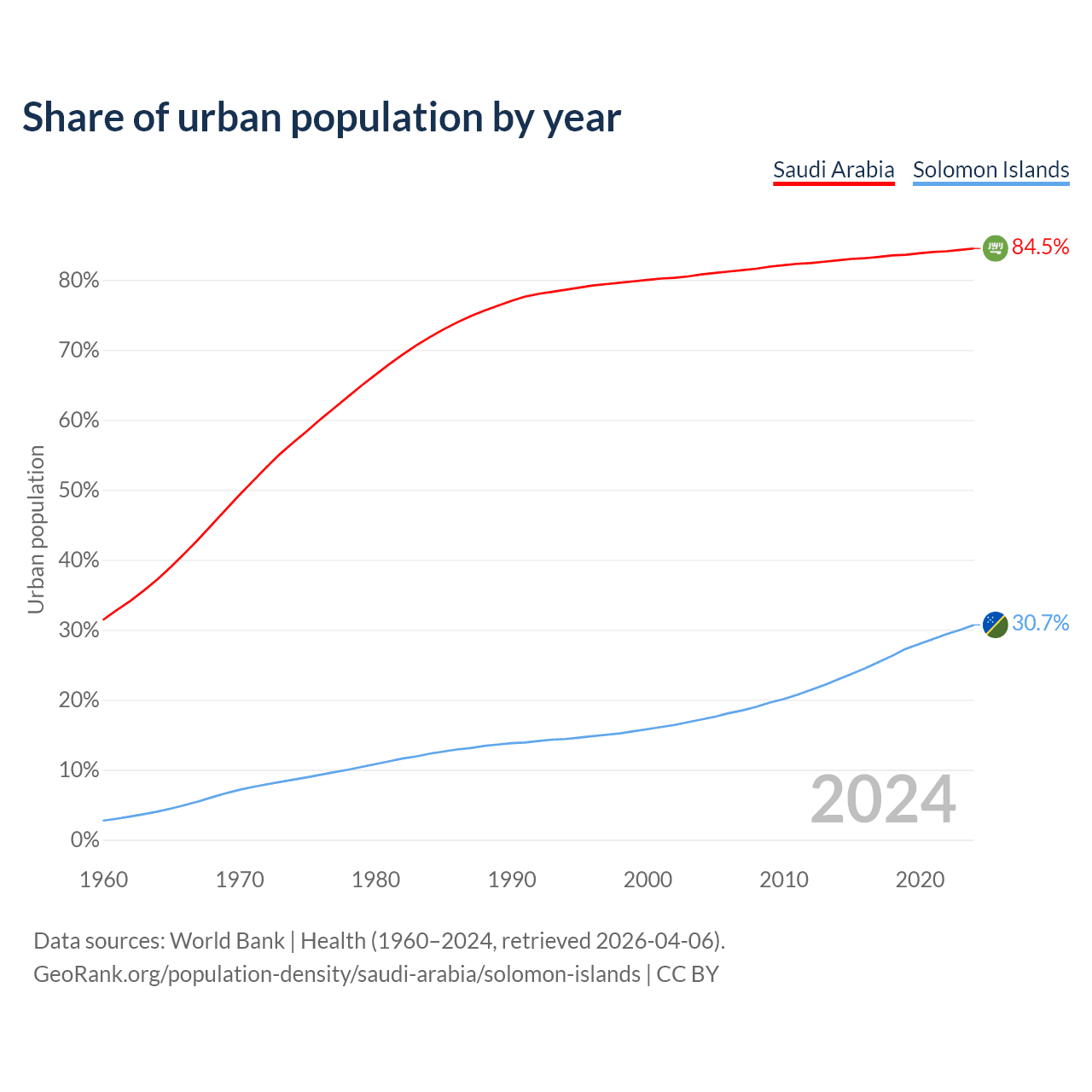 From 2004 to 2024, the share of urban population changed from 80.8% to 84.5% in Saudi Arabia and from 17.2% to 30.7% in the Solomon Islands.