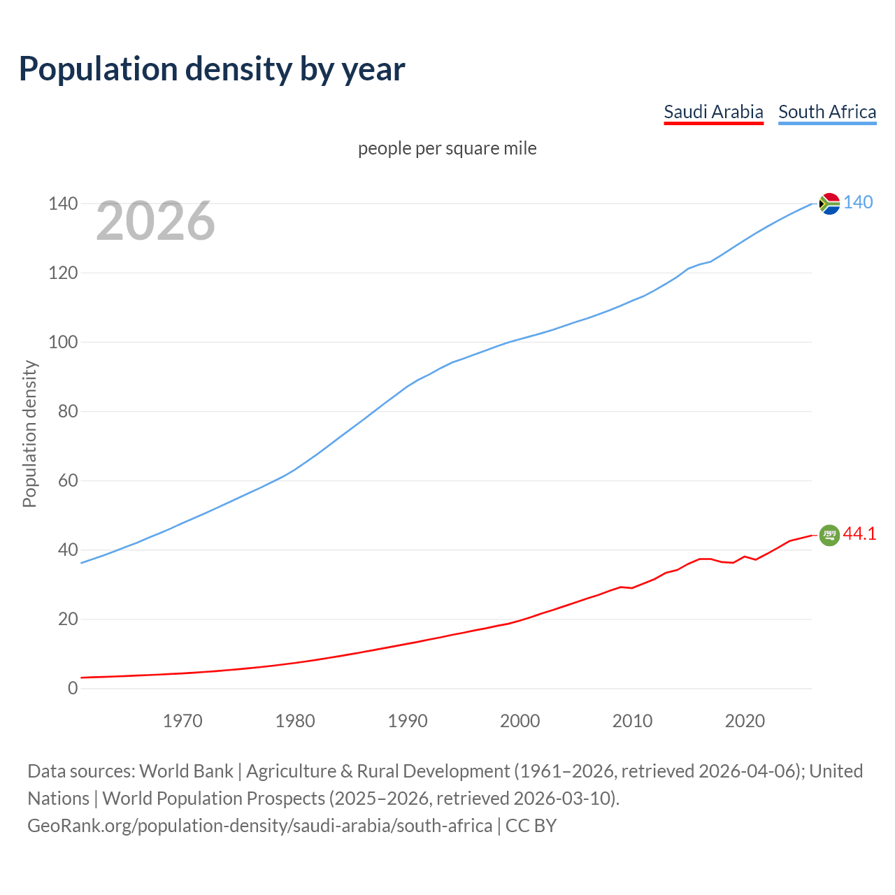 From 2006 to 2026, population density in Saudi Arabia increased by 70.4%, compared to a 31% growth in South Africa.