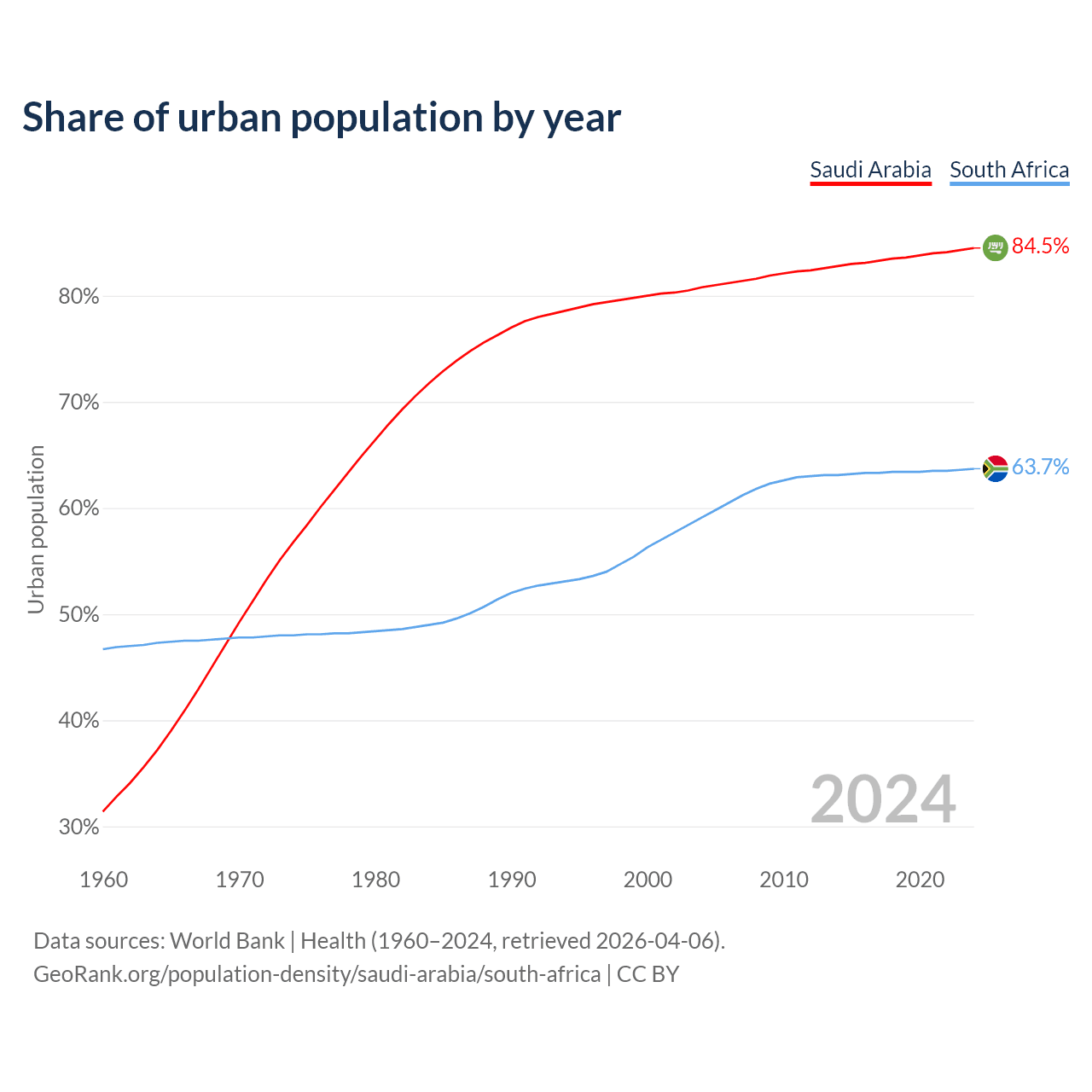 From 2004 to 2024, the share of urban population changed from 80.8% to 84.5% in Saudi Arabia and from 59.1% to 63.7% in South Africa.