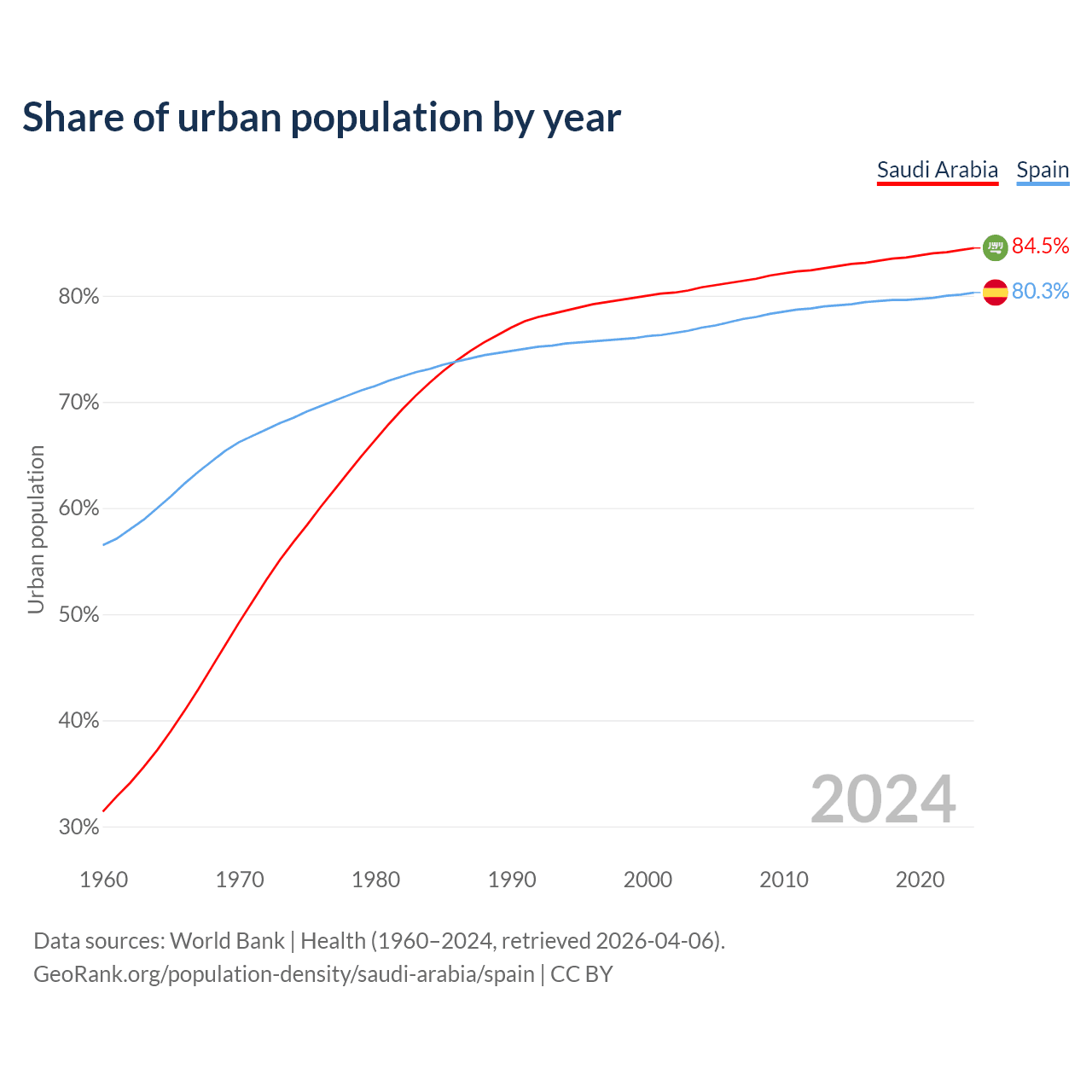 From 2004 to 2024, the share of urban population changed from 80.8% to 84.5% in Saudi Arabia and from 77% to 80.3% in Spain.