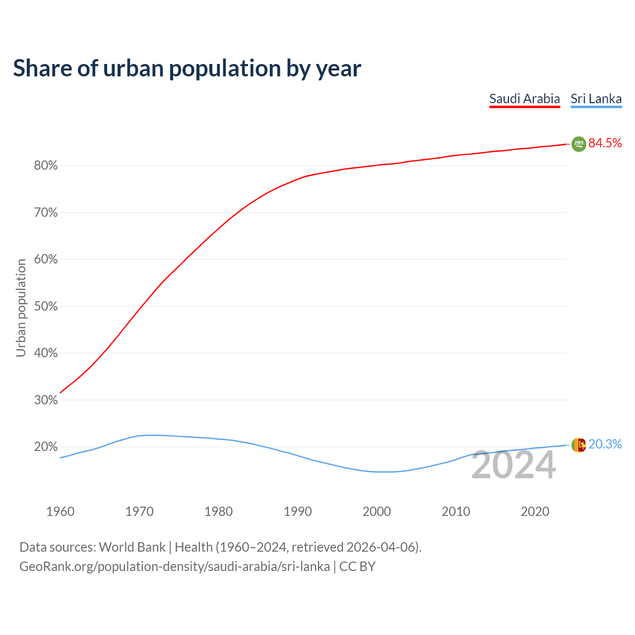 From 2004 to 2024, the share of urban population changed from 80.8% to 84.5% in Saudi Arabia and from 14.9% to 20.3% in Sri Lanka.