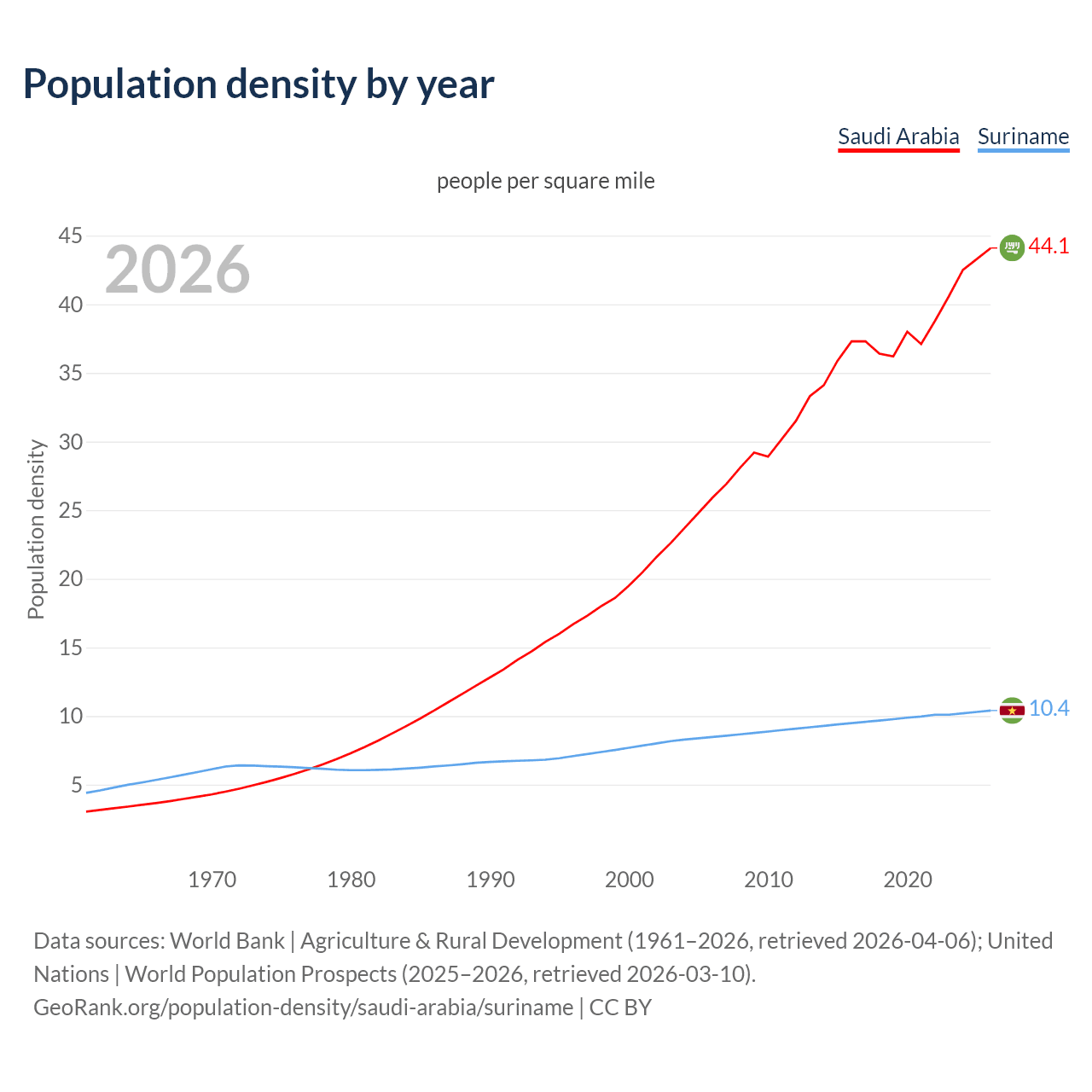 From 2006 to 2026, population density in Saudi Arabia increased by 70.4%, compared to a 22.9% growth in Suriname.