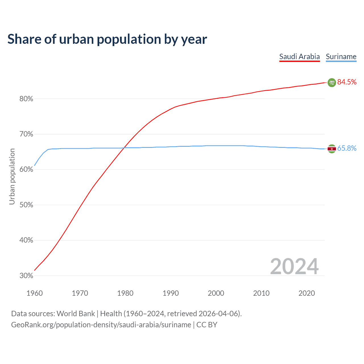 From 2004 to 2024, the share of urban population changed from 80.8% to 84.5% in Saudi Arabia and from 66.7% to 65.8% in Suriname.