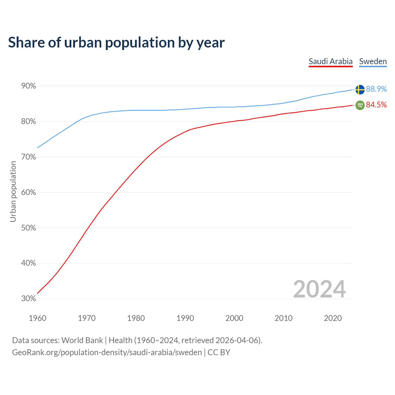 From 2004 to 2024, the share of urban population changed from 80.8% to 84.5% in Saudi Arabia and from 84.3% to 88.9% in Sweden.