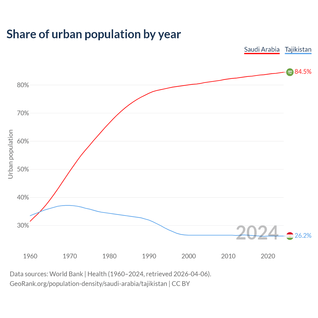 From 2004 to 2024, the share of urban population changed from 80.8% to 84.5% in Saudi Arabia and from 26.5% to 26.2% in Tajikistan.