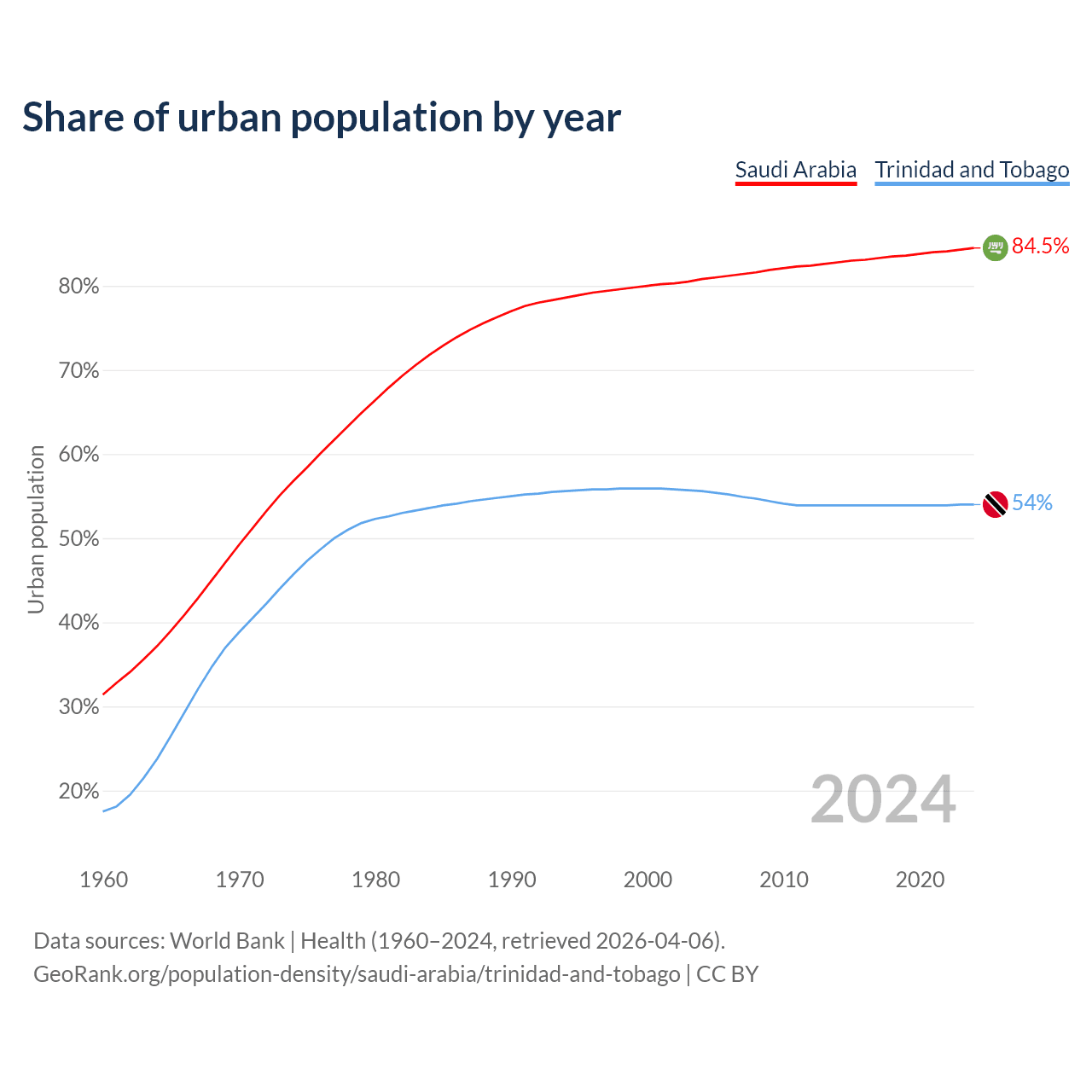 From 2004 to 2024, the share of urban population changed from 80.8% to 84.5% in Saudi Arabia and from 55.6% to 54% in Trinidad and Tobago.
