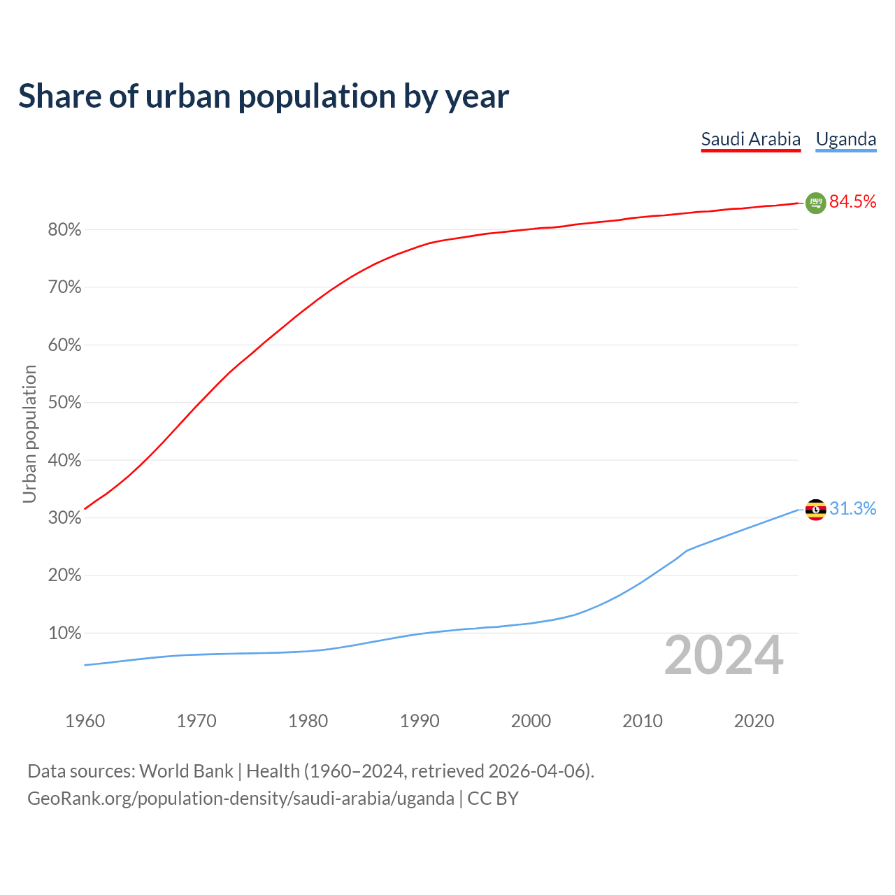 From 2004 to 2024, the share of urban population changed from 80.8% to 84.5% in Saudi Arabia and from 13.1% to 31.3% in Uganda.