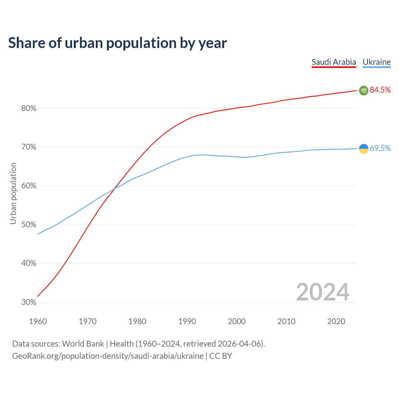 From 2004 to 2024, the share of urban population changed from 80.8% to 84.5% in Saudi Arabia and from 67.6% to 69.5% in Ukraine.