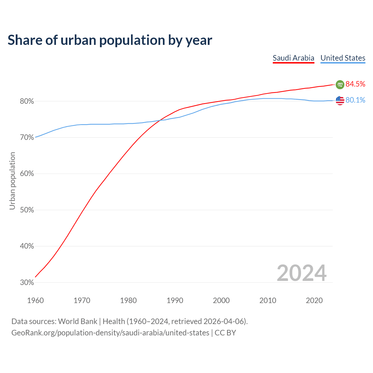 From 2004 to 2024, the share of urban population changed from 80.8% to 84.5% in Saudi Arabia and from 80% to 80.1% in the United States.