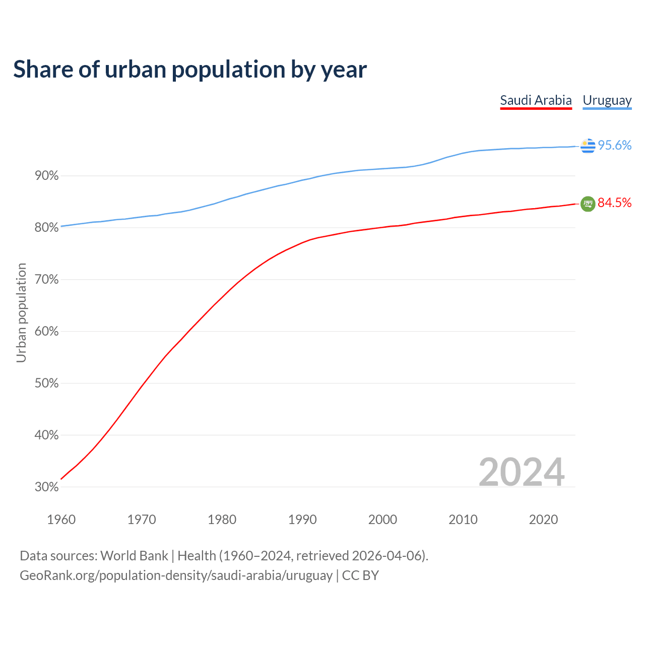 From 2004 to 2024, the share of urban population changed from 80.8% to 84.5% in Saudi Arabia and from 91.8% to 95.6% in Uruguay.