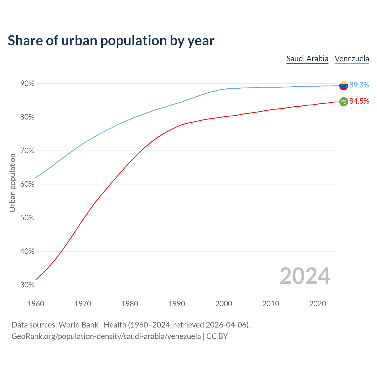 From 2004 to 2024, the share of urban population changed from 80.8% to 84.5% in Saudi Arabia and from 88.6% to 89.3% in Venezuela.