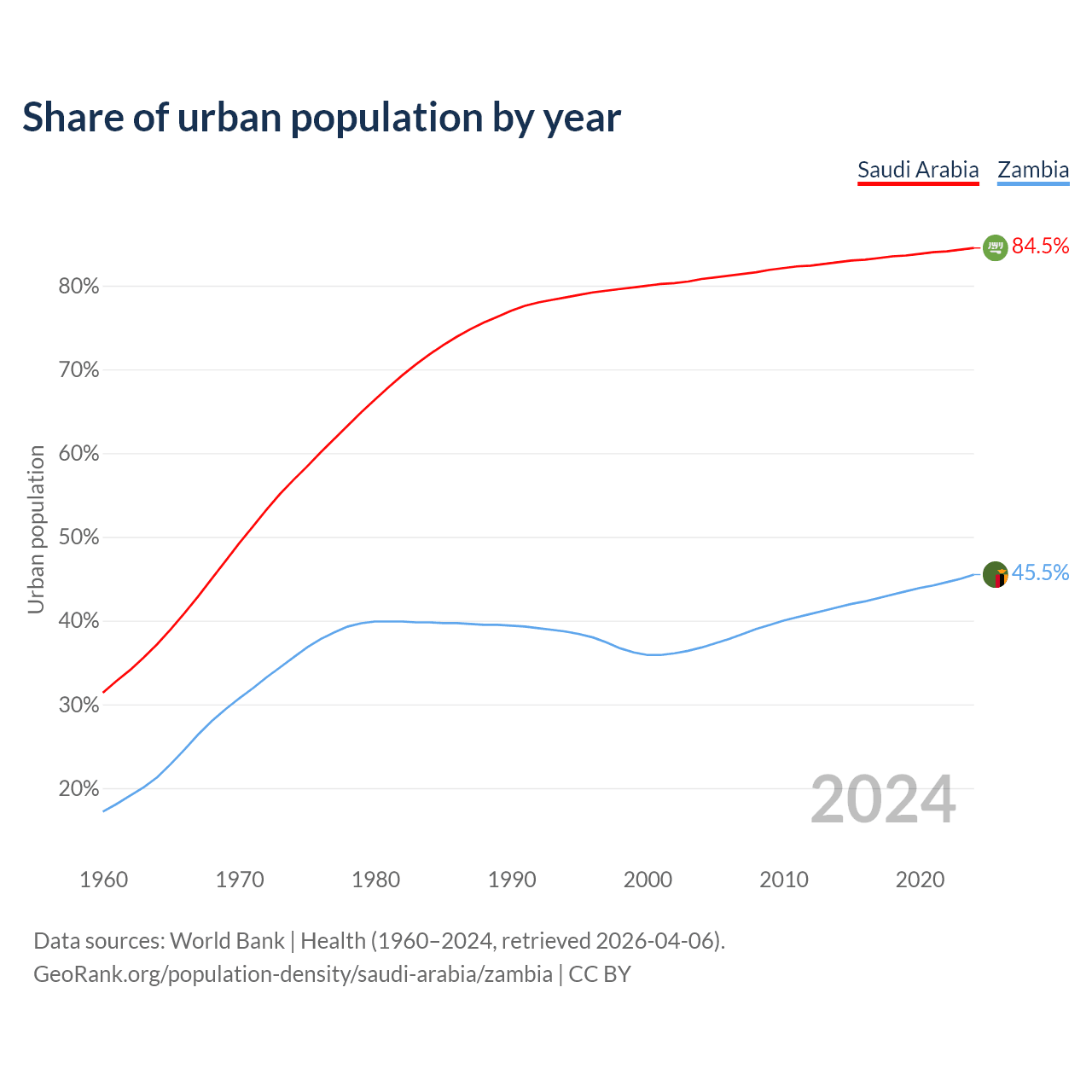 From 2004 to 2024, the share of urban population changed from 80.8% to 84.5% in Saudi Arabia and from 36.8% to 45.5% in Zambia.