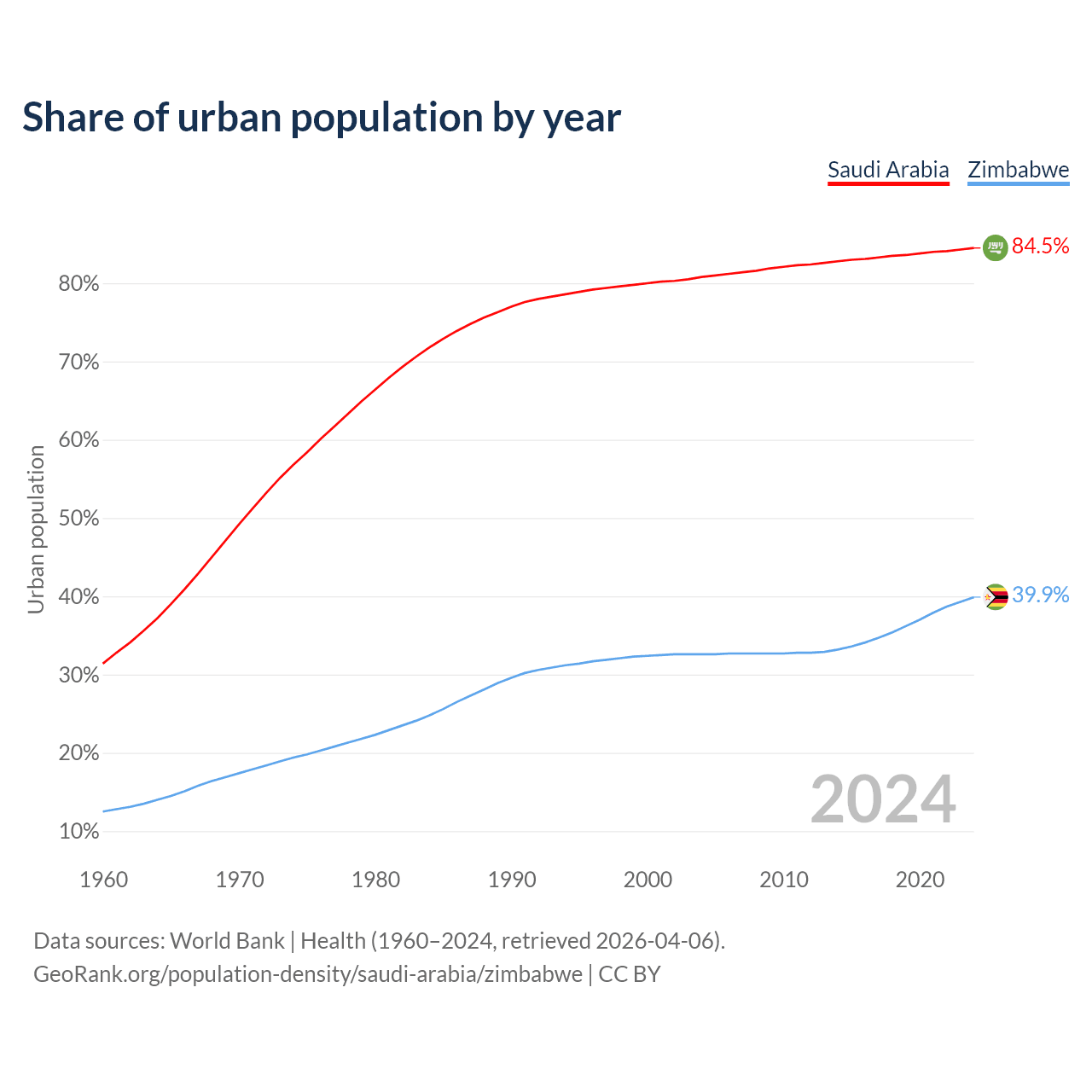 From 2004 to 2024, the share of urban population changed from 80.8% to 84.5% in Saudi Arabia and from 32.6% to 39.9% in Zimbabwe.