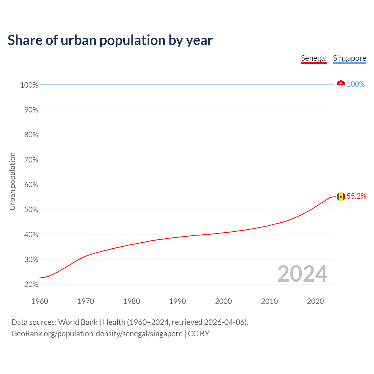 From 2004 to 2024, the share of urban population changed from 41.6% to 55.2% in Senegal and from 100% to 100% in Singapore.